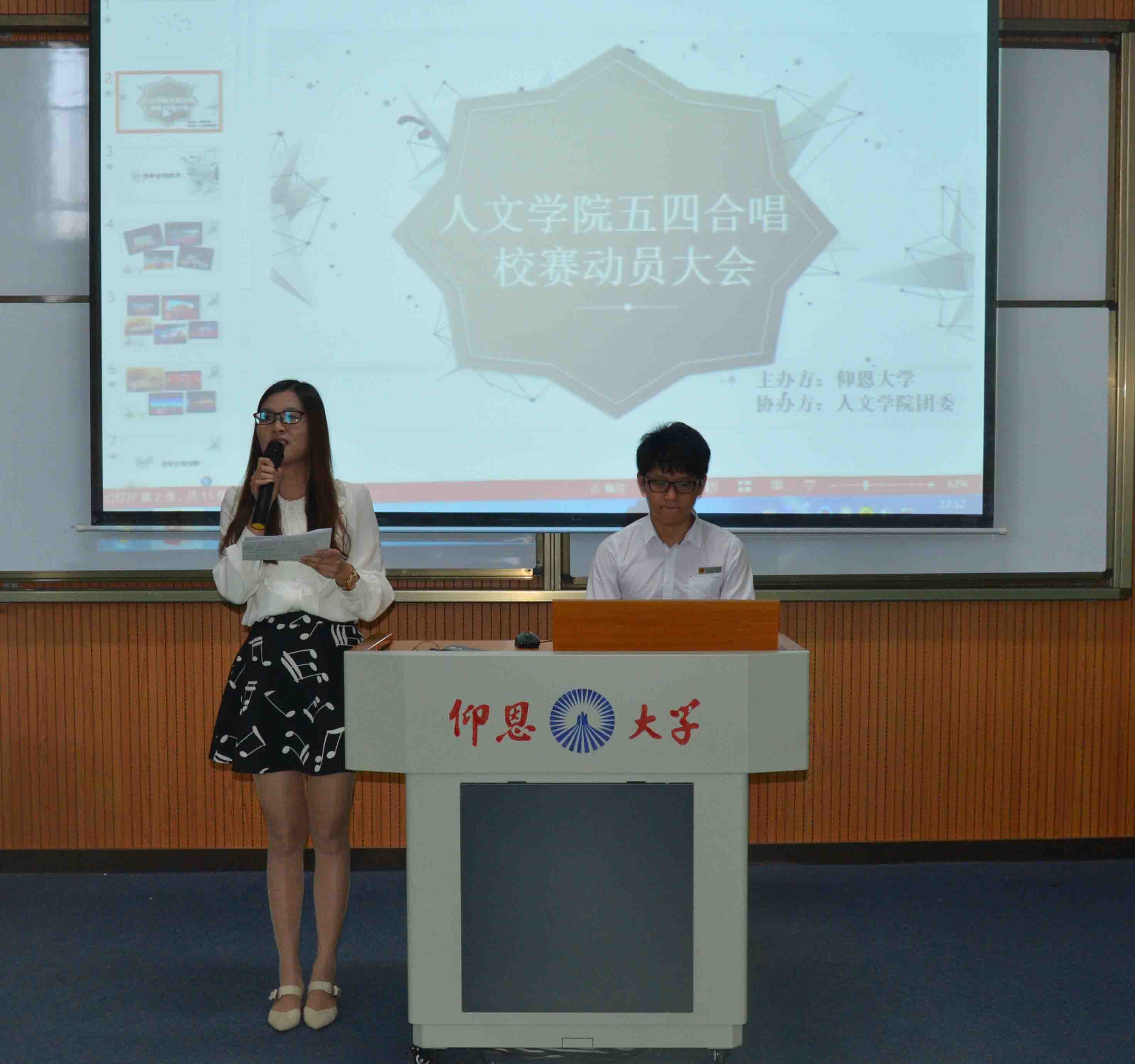 胡友仁老师率先动员讲话,他强调同学们要用心参与学校的品牌活动,学校运动会和五四合唱节,这是每一位仰恩学子都应当全员参与的学校的品牌活动,为学校品牌活动尽心竭力,应该是无上光荣的。同时,号召大家重在过程,用心去演绎歌曲,严格排练纪律,严格考勤,全心投入,全力以赴。