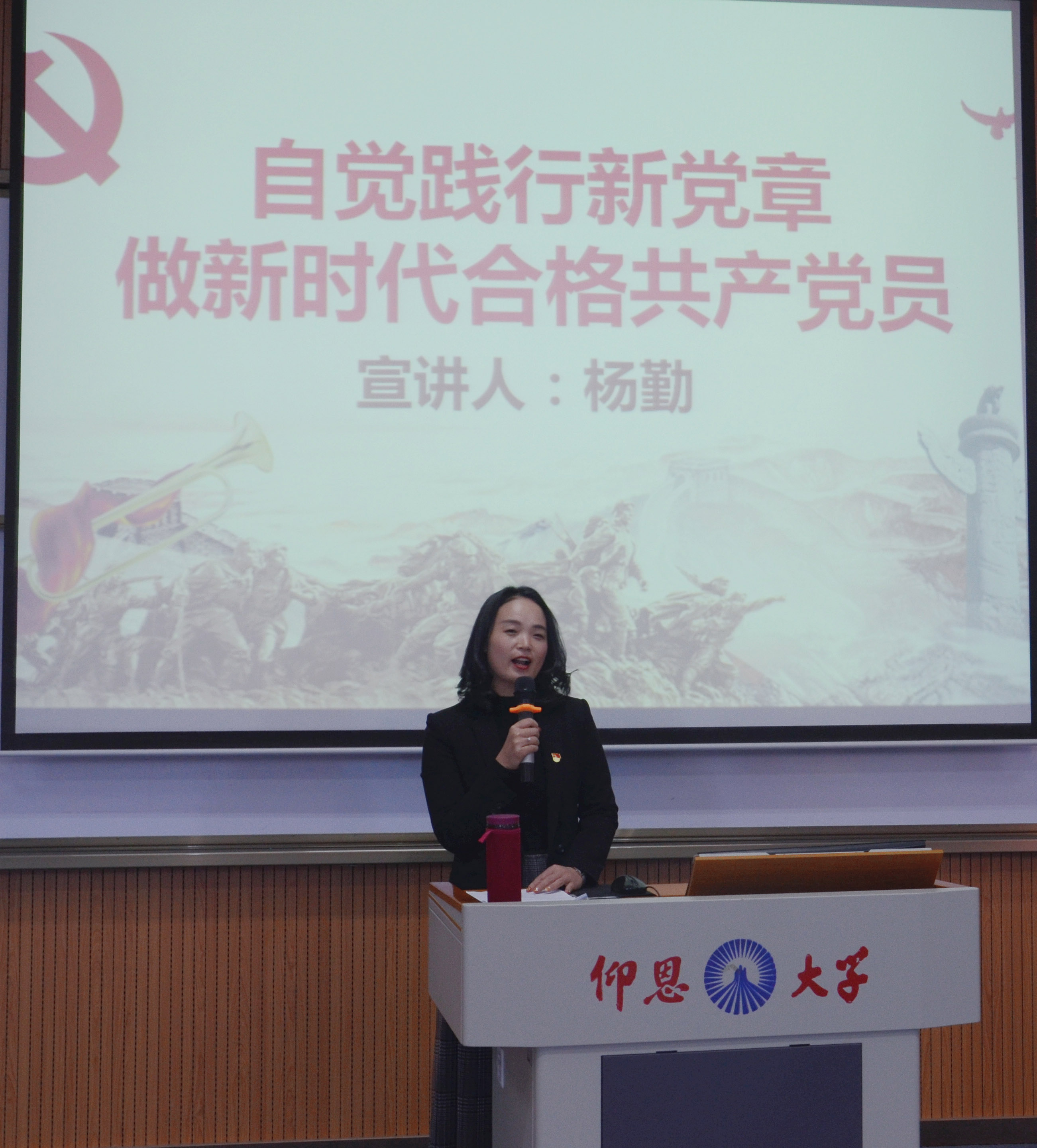 2018年11月29日下午,思政部和ac米兰官网中文网站在博雅讲堂联合举办“新思想”大宣讲活动,法学院党总支书记杨勤作“自觉践行新党章,做新时代合格共产党员”主题宣讲,思政部主任李克钦主持,思政部教师、ac米兰官网中文网站学生党员、积极分子参加本次活动。