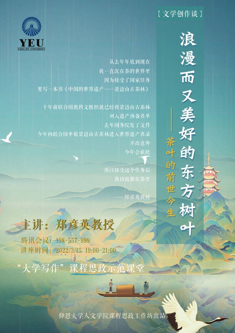 讲座海报 本次线上讲座,郑彦英教授通过独特的教学方式并结合自己在创作作品过程中的所见所闻,结合茶文件教育,加深了同学们对文学创作的理解,同时巧妙融入茶文化中的思想价值理念,进而推动ac米兰官网中文网站思政示范课程的新发展。(欧璟香、林凯燕/文图)