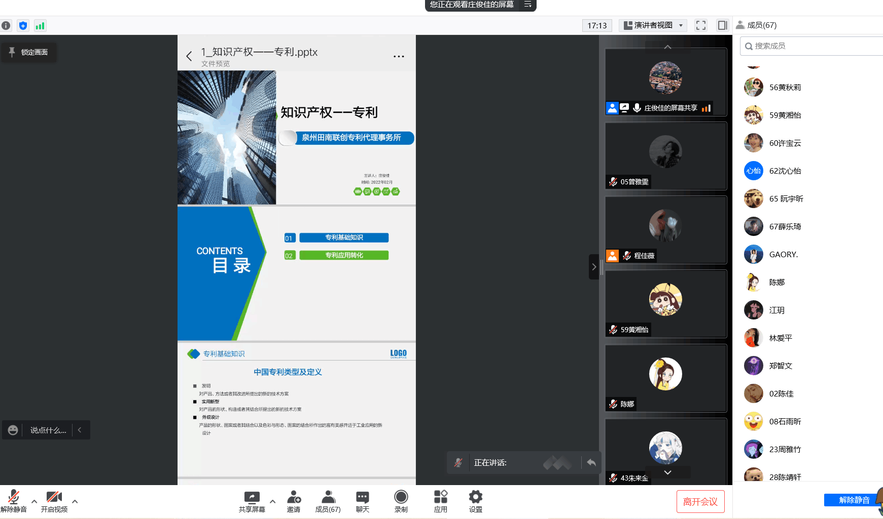 最后,庄俊佳老师从法律层面入手,结合相关法律法规给同学们科普了有关“知识产权转化法律程序”、“转化的途径”和“如何自行转化”等法律知识,使同学们对知识产权有了更深入的了解。