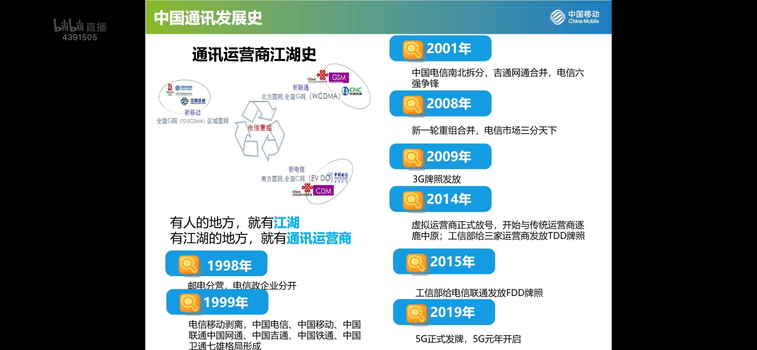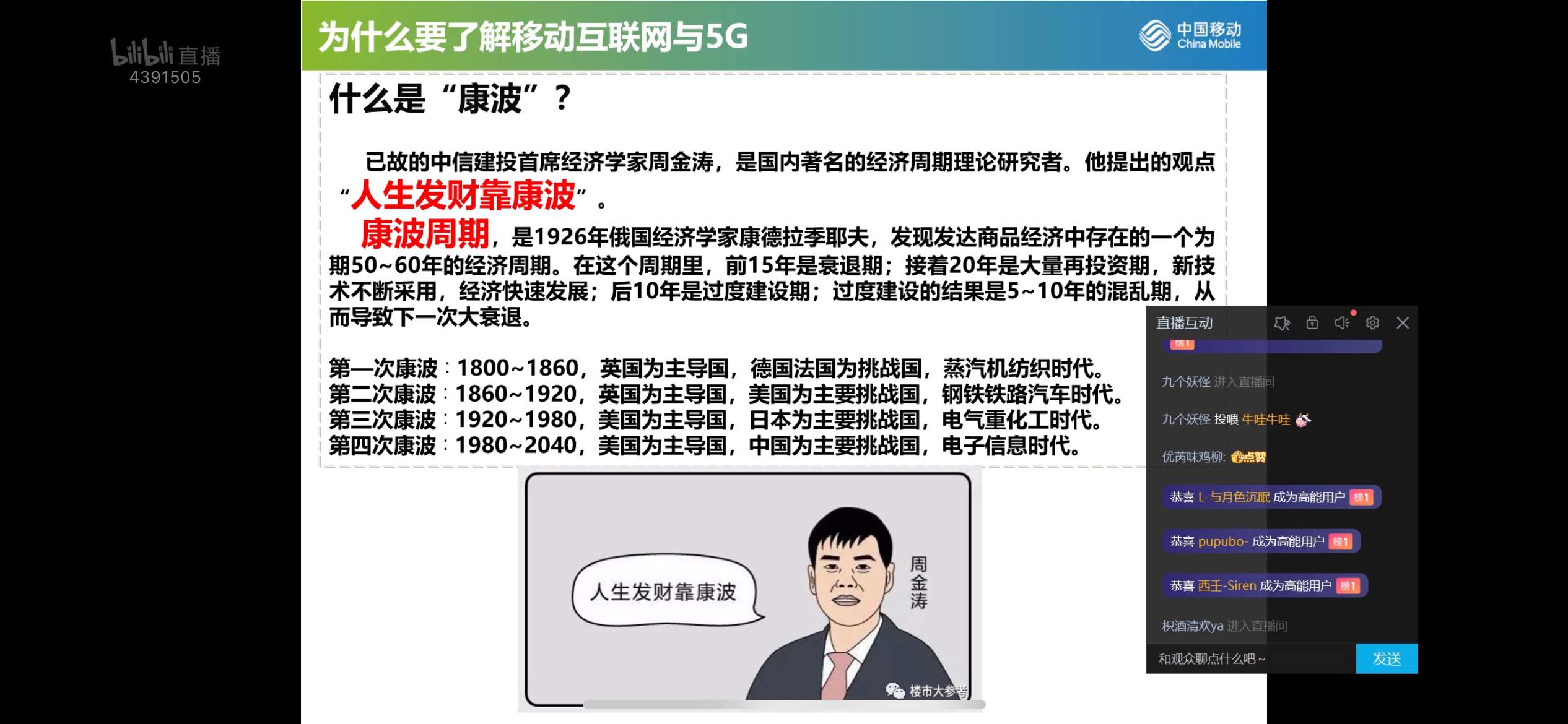 课件截图 课程开始前,外聘教师张潮指出5G工程是在互联网不断发展的基础上出现的新一代宽带移动通信技术,是实现人机物互联的网络基础设施。随后,以“康波”概念引出“为什么要了解移动互联网与5G工程”,并向同学们表明了发展互联网与5G工程技术对国家的意义。