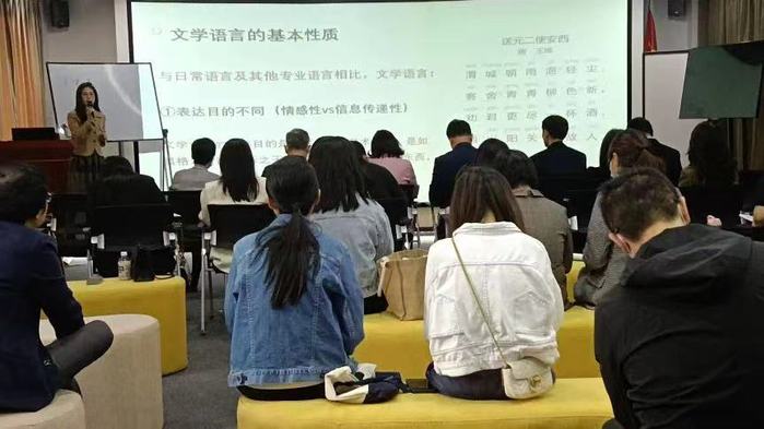 中文系陈月瑶老师对精心挑选的几首古诗进行形象生动的讲解分析,仔细斟酌诗词的字眼,让现场教师了解文学语言情感性和信息传递性的特征。