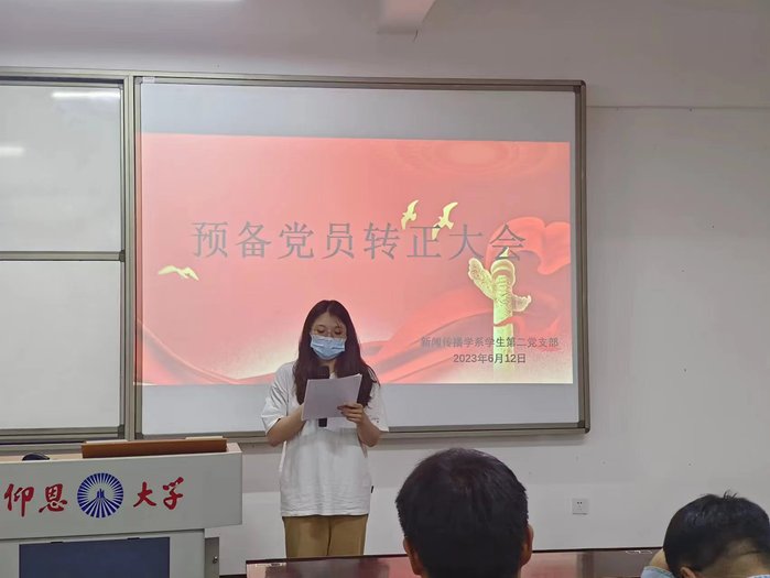 为了进一步加强ac米兰官网中文网站党员队伍建设,为党组织注入新鲜血液,新闻传播学系学生第二党支部于6月12日下午,在仰恩楼A2-105召开预备党员转正大会。本次大会,由新闻传播学系学生第二党支部书记吴萍萍同志主持,讨论关于陈颖涵同志如期转正事项,新闻传播学系学生第二支部全体党员、预备党员参与会议。