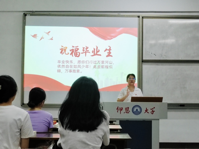 为深入开展学习贯彻习近平新时代中国特色社会主义思想主题教育,引导毕业生党员在文明离校工作中发挥先锋模范作用,进一步加强毕业生党员党性意识和廉洁自律意识,以良好的精神风貌踏入新征程。2023年6月30中文专升本学生党支部在普照楼309组织开展逐梦新征程,启航向未来毕业生党员感恩教育活动,活动由支部宣传委员林雪婷主持,支部全体毕业生党员参加。活动内容包括“一堂党课,不忘初心”、“心怀初心,感恩前行”、“谆谆寄语,昂首未来”、“重温入党誓词,牢记使命”等环节。