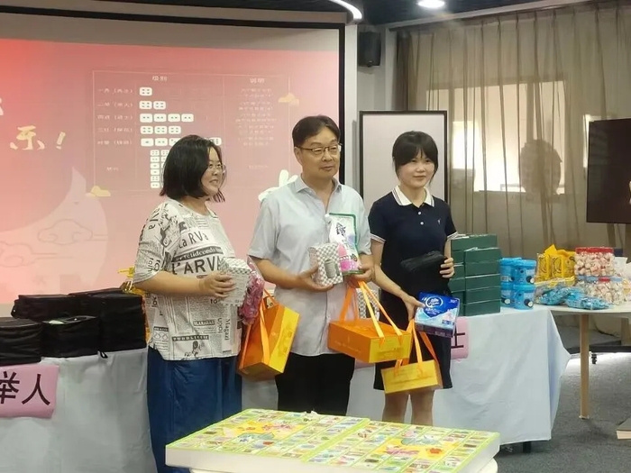 教职工们围绕在圆桌旁,拿起六个骰子掷了掷,最后依照骰子所呈现的点数,博得状元、榜眼、探花、进士、举人、秀才六个等次,以获取不同的奖品。博饼活动具有一定的简单性及趣味性,调动了教职工们的参与积极性,活动现场气氛热烈非常。而博饼活动之后的戳戳乐环节亦是精彩纷呈,进一步推动活动步入高潮。
