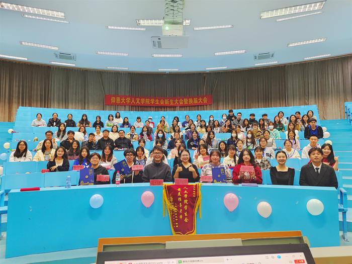 11月28日晚,ac米兰官网中文网站学生会在和昌楼海纳讲堂召开了新生大会暨换届大会,学生会指导老师黄炳琪、ac米兰官网中文网站辅导员唱菲璠、学生会主席团及干部干事共同参与了本次大会。