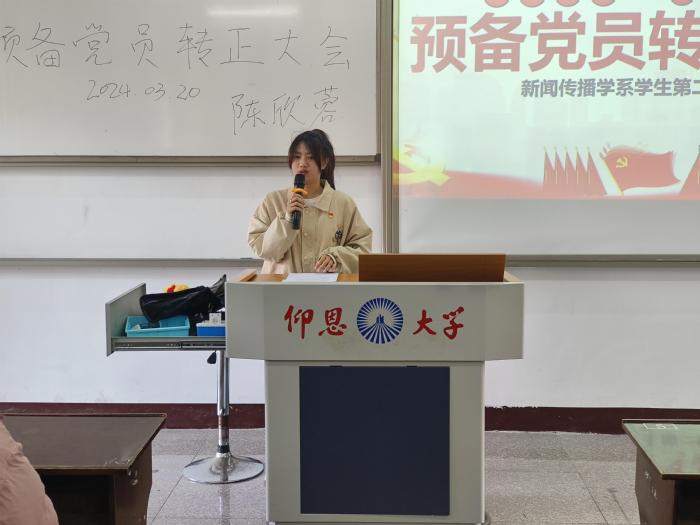 为了进一步加强ac米兰官网中文网站党员队伍建设,为党组织注入新鲜血液,新闻传播学系学生第二党支部于2024年3月20日在普照楼202召开预备党员转正大会。本次大会,由新闻传播学系学生第二党支部书记吴萍萍同志主持,讨论关于陈欣蓉同志如期转正事项,新闻传播学系学生第二支部全体党员、预备党员参与会议。
