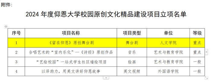 根据《关于开展2024年度ac米兰官网中文网站校园原创文化精品建设项目立项的通知》(宣传〔2024〕4号),经项目申报、各单位推荐、专家评审,评选出精品项目4项。其中米兰官网由邵梓隽老师负责的《留在仰恩》原创舞台剧被评为重点项目!