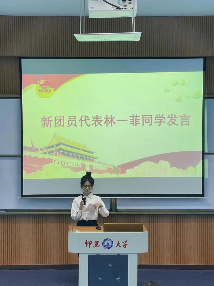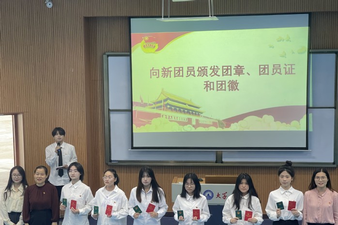 党总支书记岳秀文老师、党总支副书记朱婷老师、团委书记姜琦老师、新闻系团总支书记戴舒容老师、中文系团总支书记林思彤老师上台为新团员佩戴团徽,颁发团章和团员证。