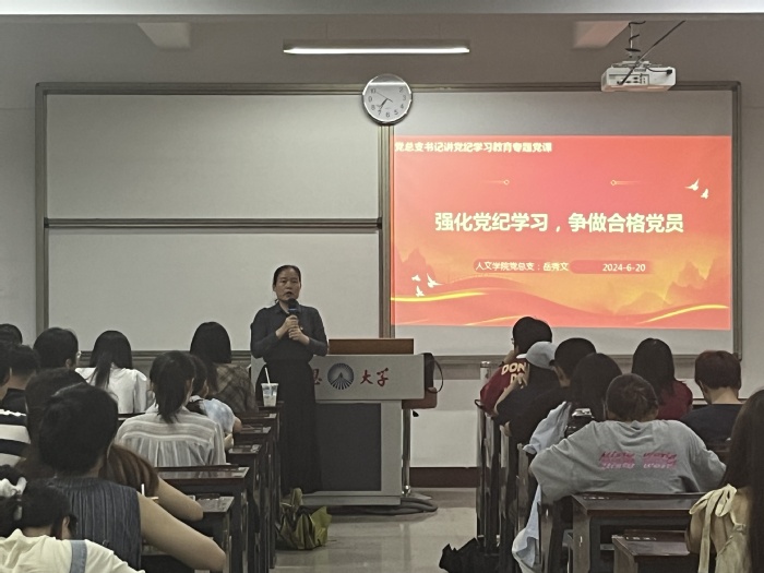 党课上,岳秀文老师围绕新修订的《中国共产党纪律处分条例》结合典型案例与个人切身感悟,从纪律建设的重要性与意义、规矩意识的培养和实践以及争做遵规守纪的合格党员等三个方面对《中国共产党纪律处分条例》的主要内容进行了讲解。