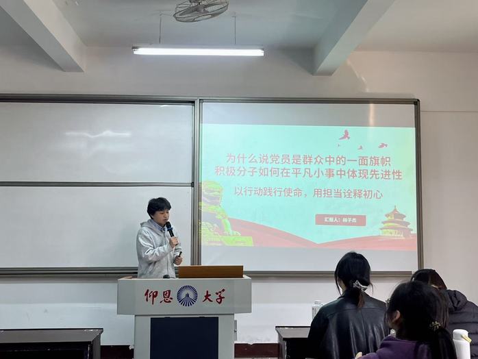 首先,围绕“剖析大学生入党积极分子易忽视的短板并提出改进策略”这一主题,陈铭慧同学从党的历史与新时代使命切入,通过革命年代战略智慧与新时代实践成果,阐明党以高效行动回应人民期待的本质。她结合党章中不谋私利的规定,剖析积极分子应以严于律己、宽以待人为准则,将权力转化为服务责任;并借鉴三省吾身传统,提出每日三问,以知行合一践初心,引发深刻共鸣。接着,围绕“积极分子如何于平凡小事中彰显先进性”这一主题,林子杰同学以行动践行使命为主线展开论述。他表示,党员的先进性不仅体现在理想信念的坚定上,更应落实到服务群众的点滴细节中。结合习近平总书记关于党员应成为群众中一面旗帜的重要论述,他通过主动维护公共环境、积极参与社区志愿服务等身边案例,生动诠释了积极分子如何在平凡小事中传递正能量。
