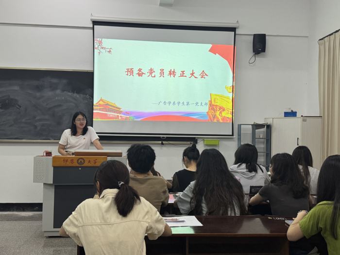 2025年6月13日,广告学系学生第一党支部在普照楼105a教室召开预备党员转正大会。本次会议由支部书记戴舒容主持,支部全体党员齐聚一堂,共同讨论苏涵、何舒静等8名同志的转正事宜。