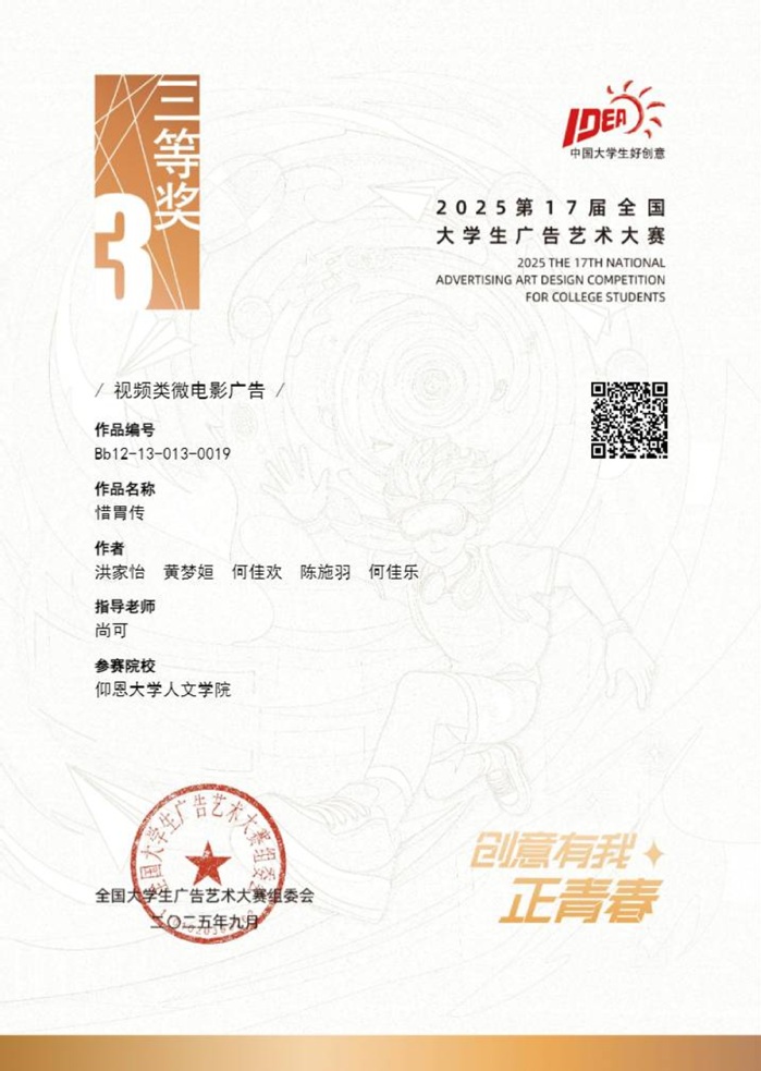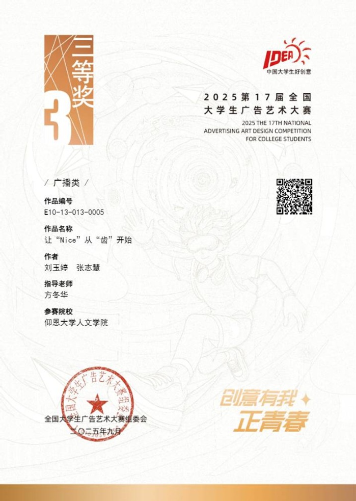 据悉,全国大学生广告艺术大赛由教育部高等教育司指导,中国高等教育学会、教育部新闻传播学类专业教学指导委员会联合主办,是面向全国高校大学生的重要专业赛事之一,也是高校推动实践教学和创意人才培养的重要平台。学院将继续坚持“以赛促学、以赛促教”的教学理念,深化实践教学体系建设,着力培养具有专业素养、创新思维与社会责任感的高素质传媒人才。(吴伊/文 ac米兰官网中文网站办公室/图)