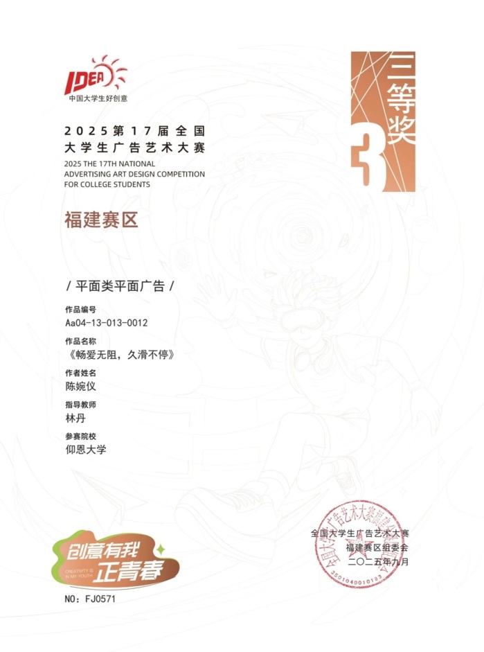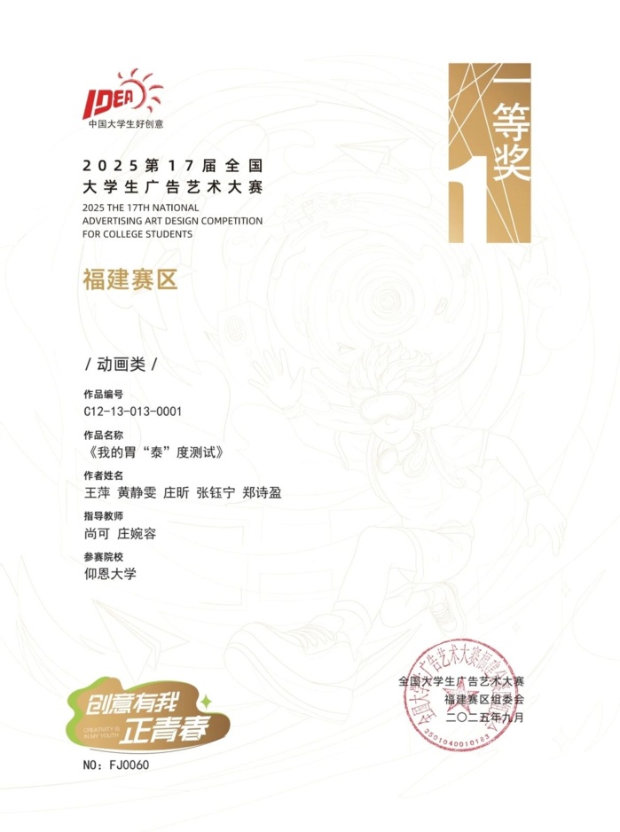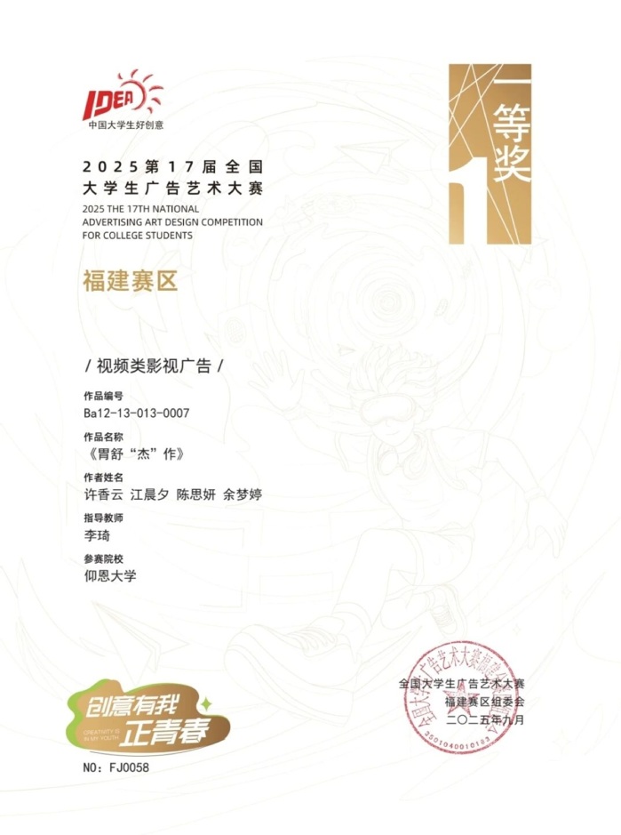 日前,第十七届全国大学生广告艺术大赛全国获奖名单公布,米兰官网学子在本届比赛中取得优异成绩,共有63件作品获奖,其中获国家级奖2项,省级奖61项。在福建省赛区,米兰官网作品获得一等奖4项、二等奖1项、三等奖11项、优秀奖45项;在全国比赛中,获三等奖2项。