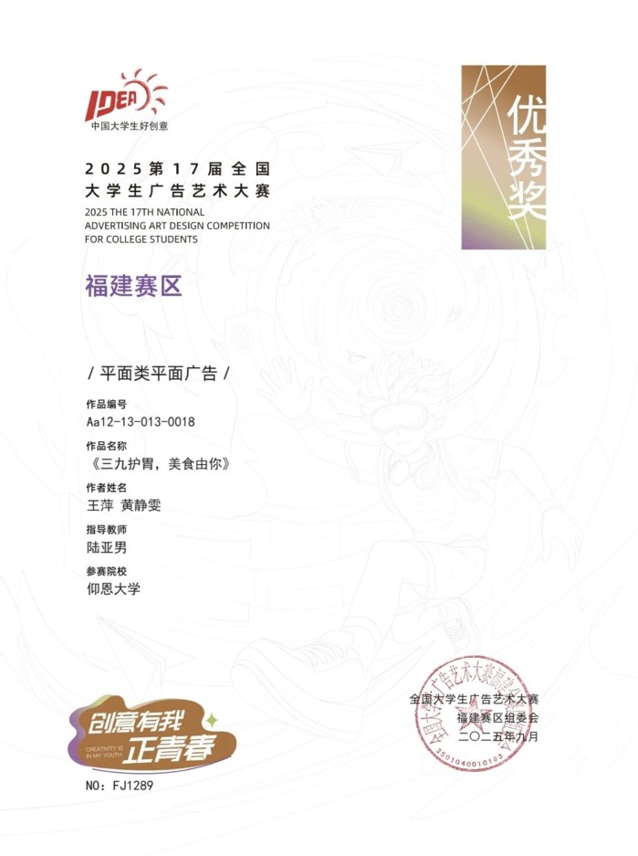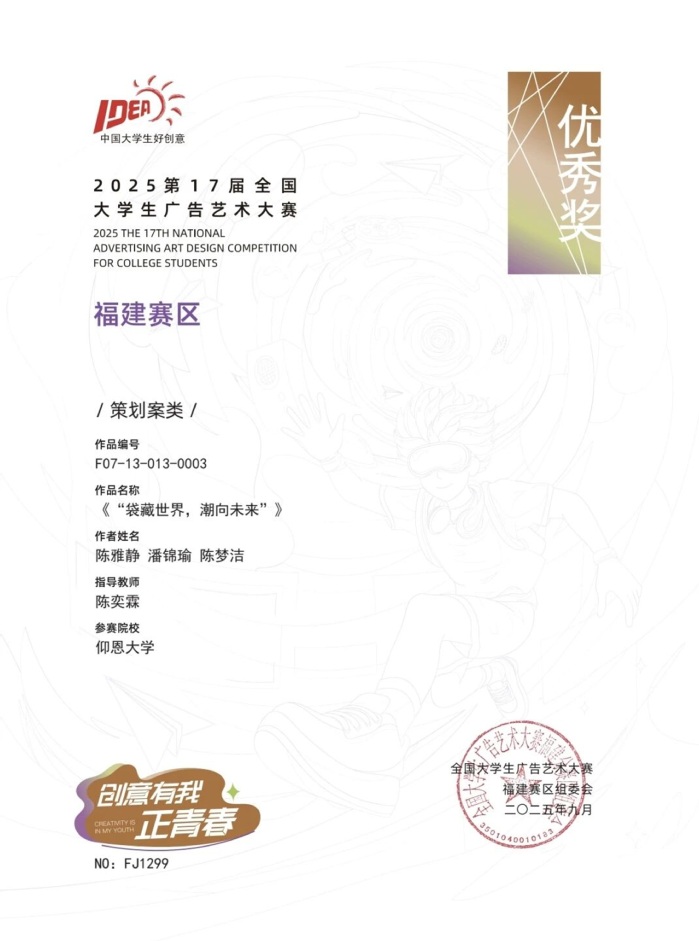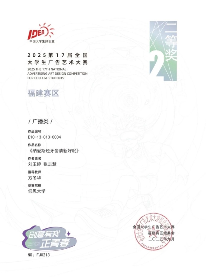 本届大赛中,米兰官网参赛作品涵盖了平面设计、影视、动画、广播、文案、策划案等多个类别,充分体现了米兰官网学生在广告创意、设计表达等方面的综合素养与实践能力。以下是部分获奖者证书展示: